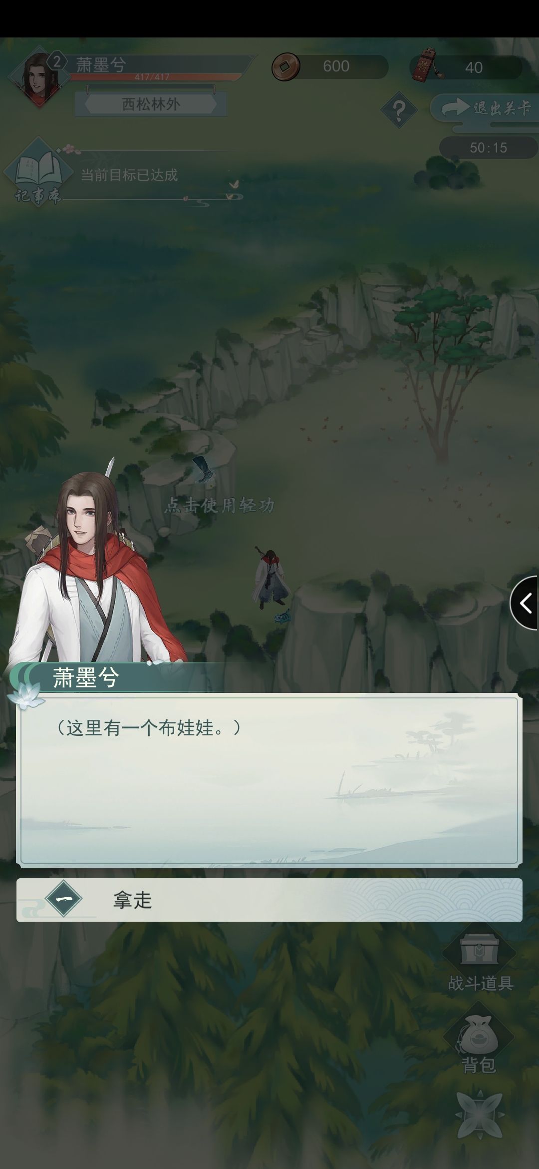 布娃娃。地图左下,用轻功飞下去的对面石头下有个布娃娃,拿到穿过蜂群给小朋友,会得到2块蜂蜜。这个后面追小眸同学挡住愤怒的野熊有用。