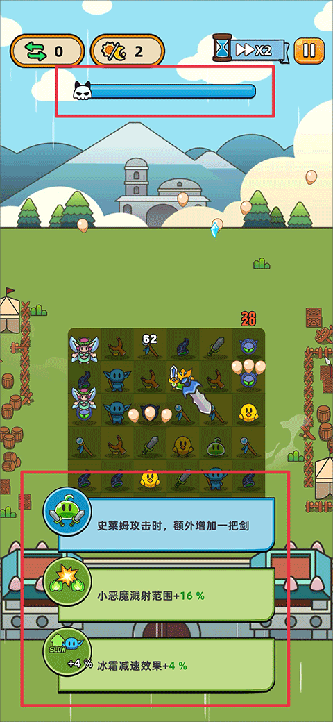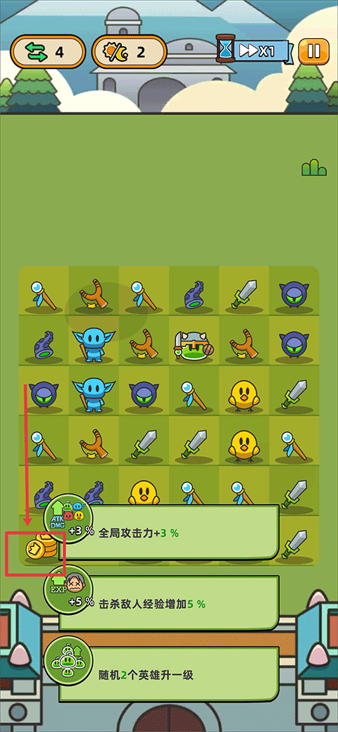 我方英雄在成功抵挡出现的敌人后会获得分数,当上方进度条满时同样可以解锁技能选择功能
