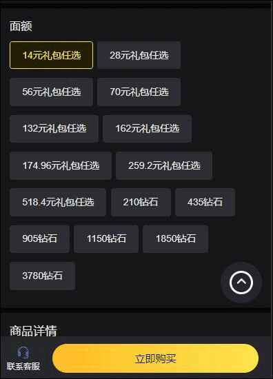 2、然后在充值面额处选择想要的面额,如果是礼包任选那么可以通过下方表格确认,钻石则无需确认;