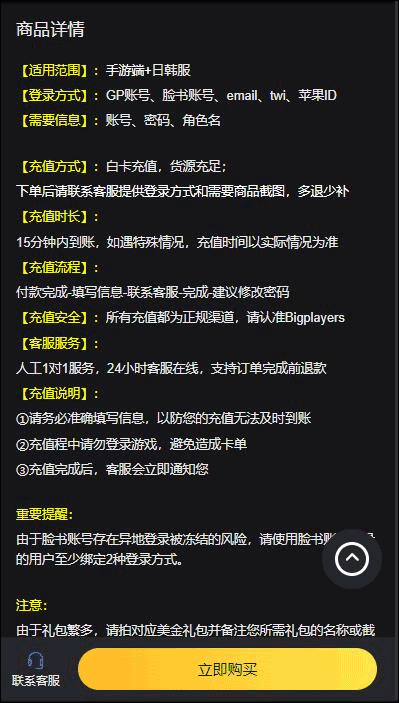 注:一定要仔细阅读充值说明,脸书账号需要特别注意,如果出现未到账问题,请尽快联系客服解决!