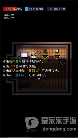 6.黄色箭头可以进行存档,绿色箭头进行搜刮物资,蓝色箭头进行睡觉补充饱食度,并且尸体也能进行搜刮