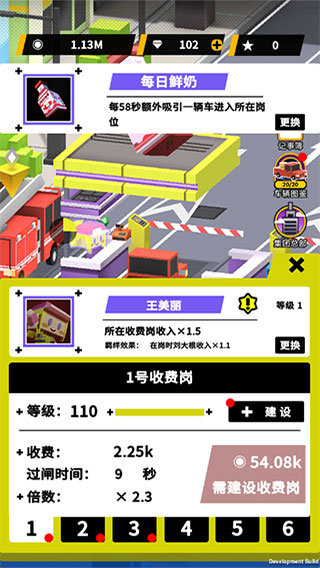 玩法的核心就是通过不断建设收费站,升级设施获得更多的利润。