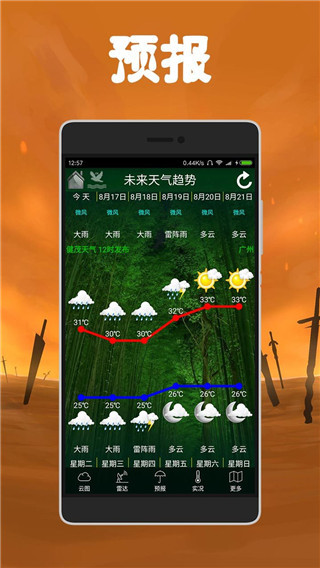 该软件不仅体积小巧、界面简洁友好,还依托国内外各大气象网站的数据支持,采用图说天气的形式,不仅可以提供两千五百多个县级以上城市的天气实况和预报等信息,还能展示一周内的气温趋势图、实况温度计动画和风向风力盘图等。此外,它还支持台风实时路径、流场动画展示等功能,为您带来及时、全面、准确的天气预报服务,使您的出行无后顾之忧。同时,健茂天气最新版还配备了最新的卫星云图、空气质量预报图、雷达拼图、降水量预报图和动态云图等多种功能设置,使每日天气预报更为直观,无论是晴天、多云还是下雨都能一目了然,让每位用户随时随地掌握最新的天气情况。需要的朋友们快来本站免费下载体验吧!