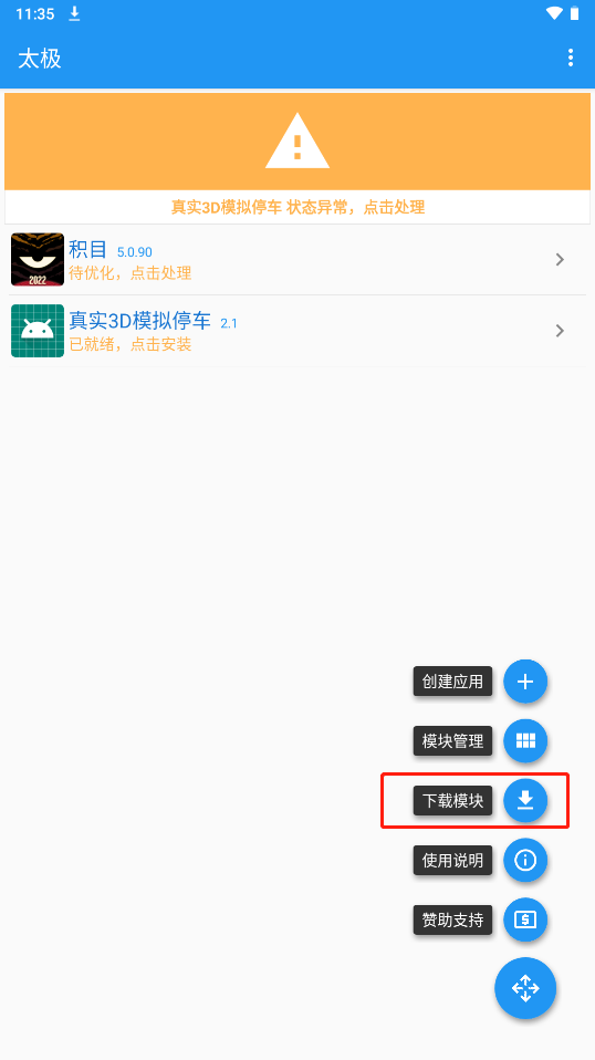 打开模块管理就可以看到安装的模块,勾选模块的时候会提示该模块支持应用的版本,而应用版本也可以再太极主界面看到,版本不兼容是使用不了模块的 。