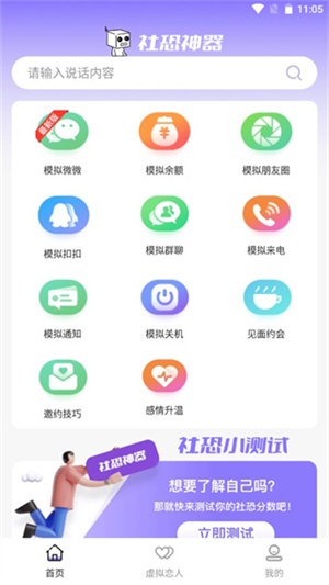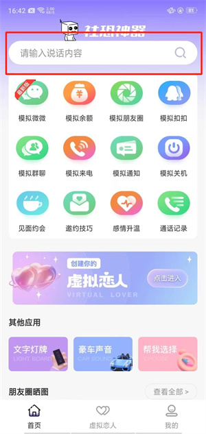 首先,在本站下载并安装好之后,打开软件,在首页有模拟微微、模拟余额、模拟朋友圈等功能;用户可以根据自身需求来选择;