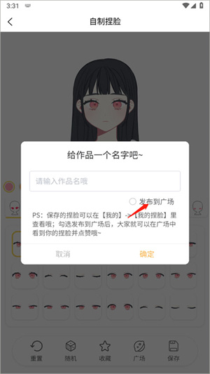 在制作完捏脸保存时,在保存的弹框中勾选发布到广场,保存后作品会同步到广场