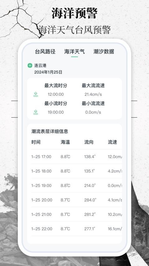 潮汐和台风等海洋灾害,为用户提供准确的预警信息,帮助沿海地区居民提前做好防范措施防患未然。
