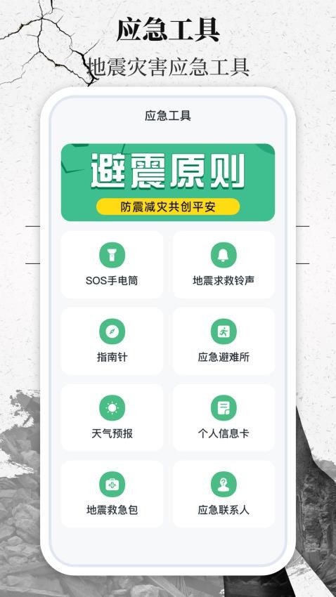包含手电筒、指南针、GPS定位、查找避难场所、紧急电话等实用小工具。