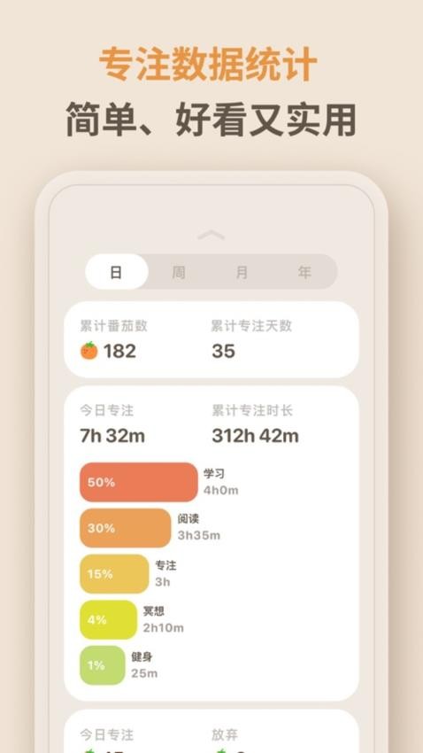 专注数据统计。你可以轻松的了解不同类型的专注时长分布。数据图依旧保持了我们简单、实用的设计思路。只展示重要的数据信息,聚焦质量、拒绝冗余。