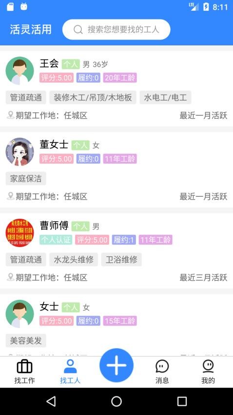 界面中汇聚了大量工人资源,按照招工需求对相关的专业工人进行查找;