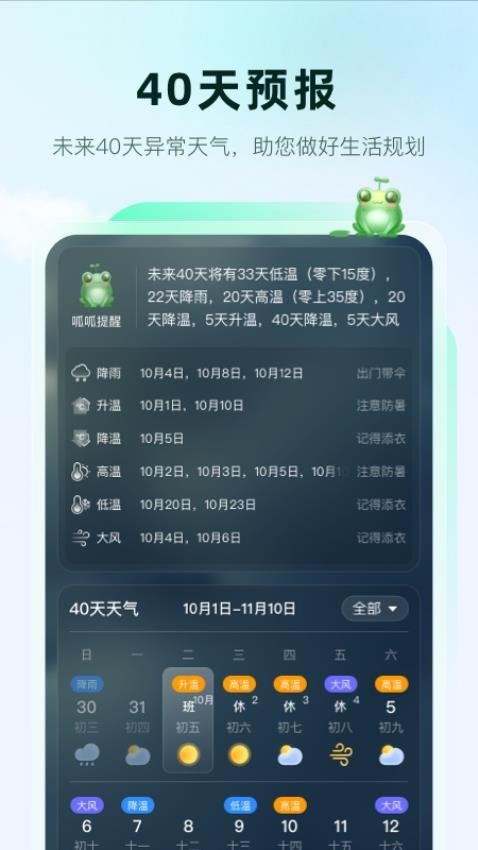 未来15至40天的降雨降雪、气温、湿度、气压、日出时间、日落时间、月相变化、紫外线强度以及温差等多方面预测。